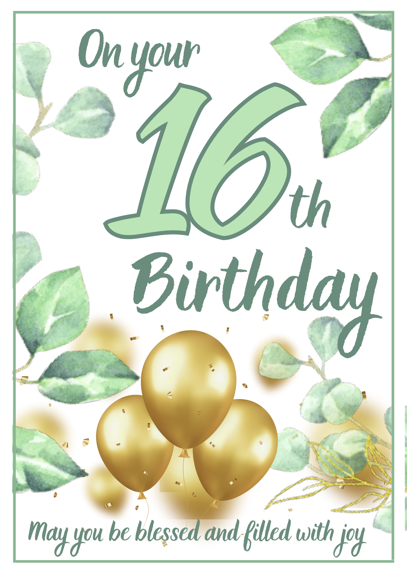 Front of card reads: On your 16th/18th/21st/30th/40th/50th/60th/70th/80th/90th/100th Birthday - May you be blessed and filled with joy