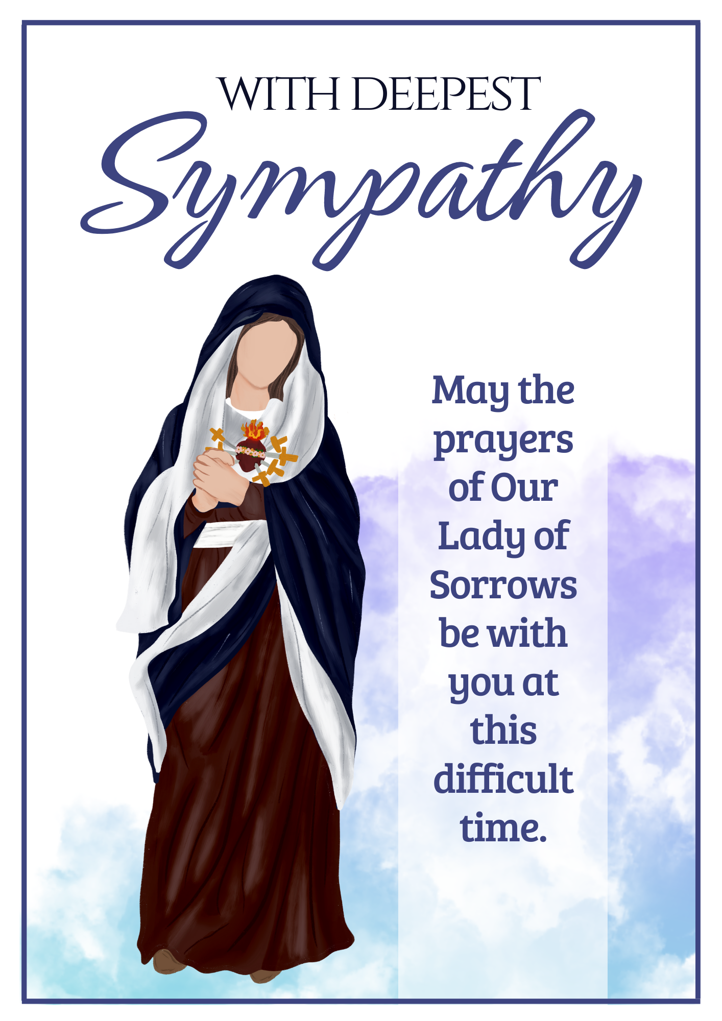Front of card reads: With deepest Sympathy - May the prayers of Our Lady of Sorrows be with you at this difficult time.