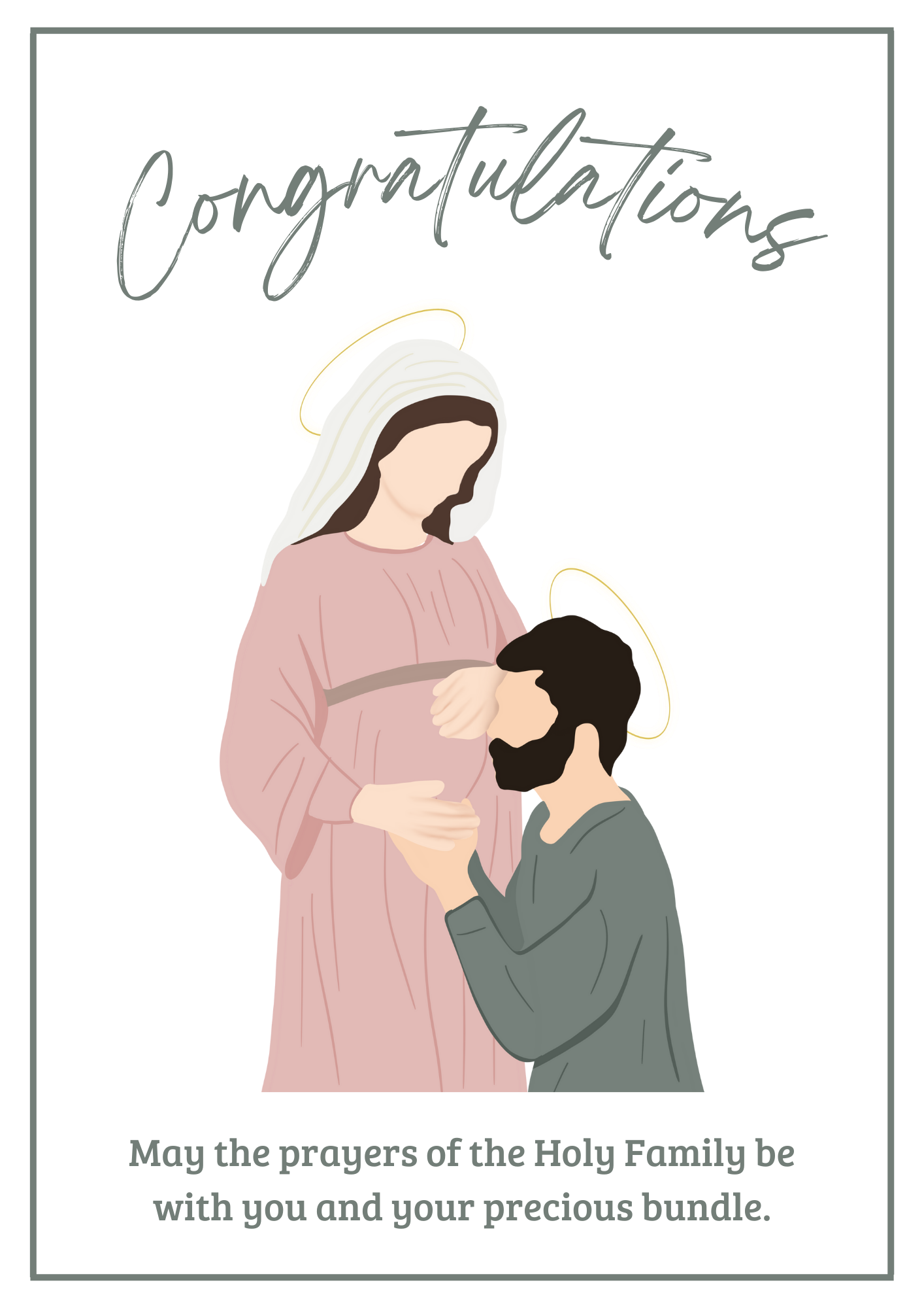 Front of card reads: Congratulations - May the prayers of the Holy Family be with you and your precious bundle