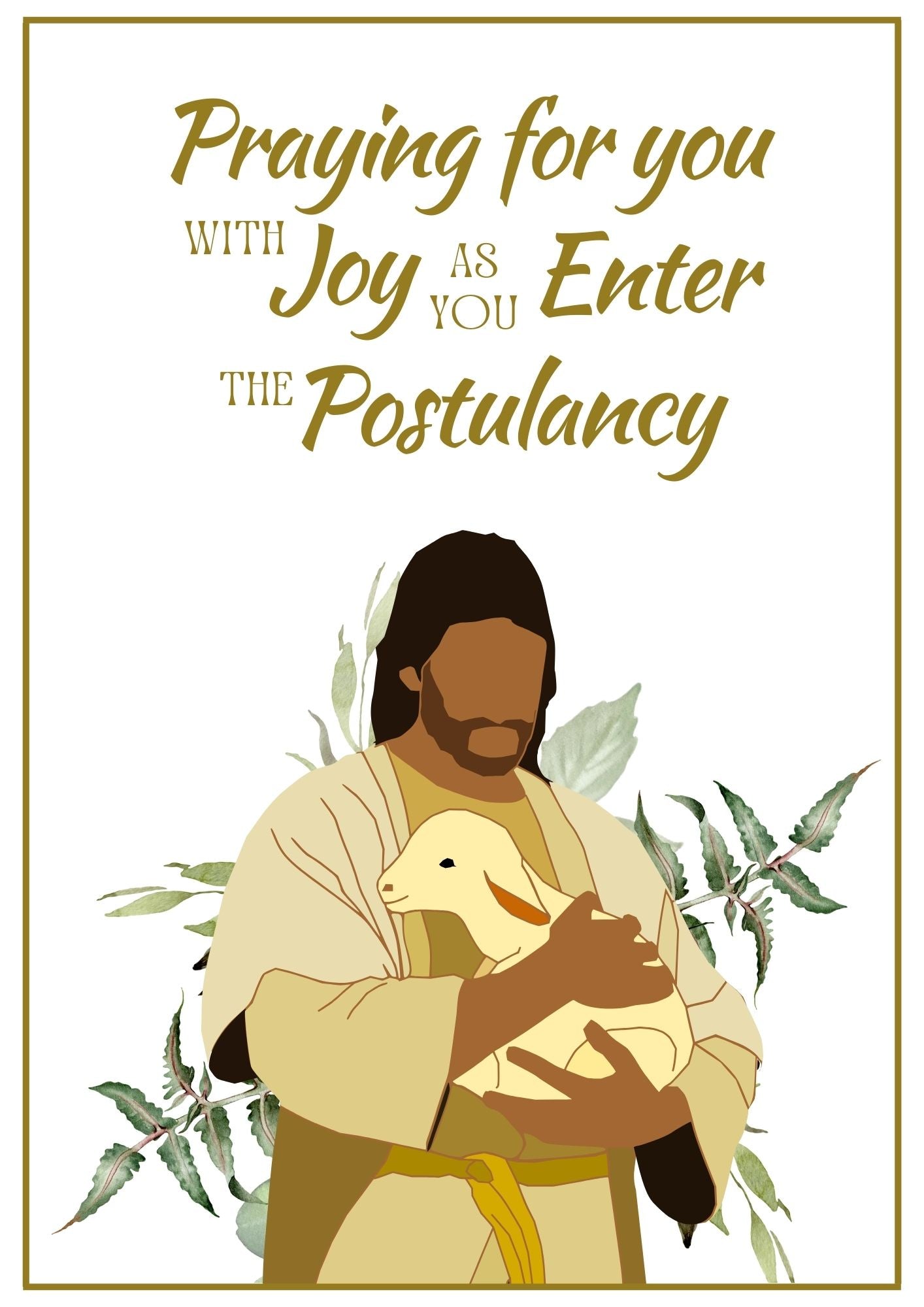 Front of card reads: Praying for you with Joy as you Enter the Postulancy