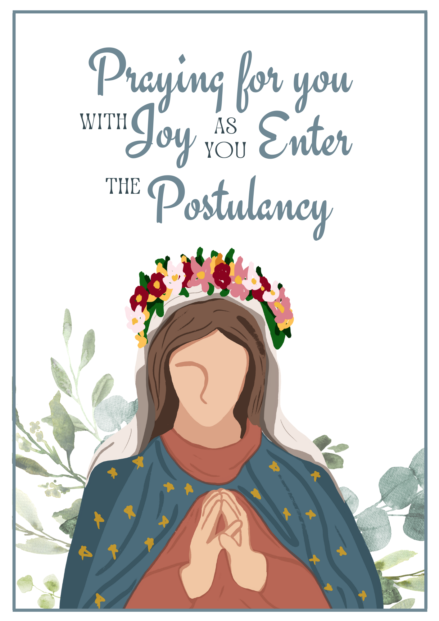 Front of card reads: Praying for you with Joy as you Enter the Postulancy